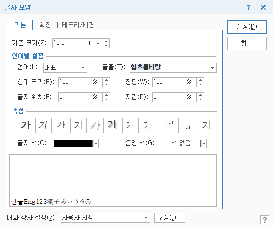 글꼴, 글자크기, 장평, 자간, 윗첨자, 아래 첨자와 같은 글자 모양과 같은 설정들을 잡아줄 수 있습니다