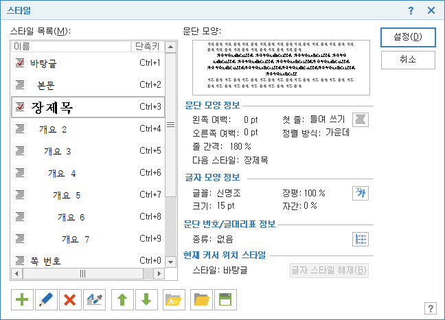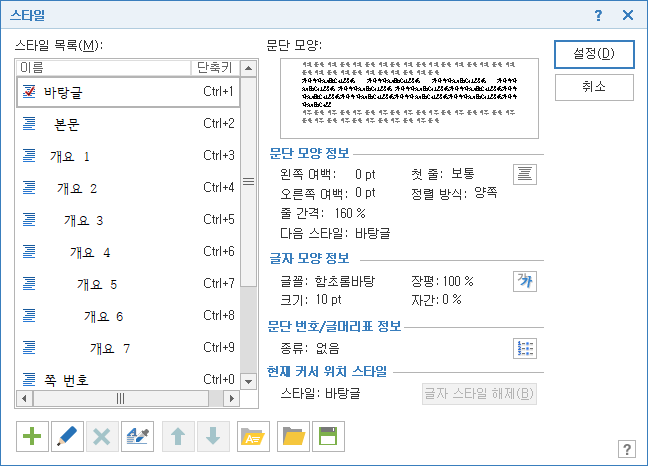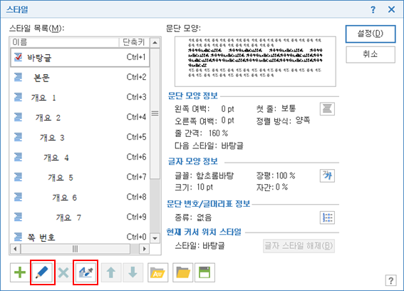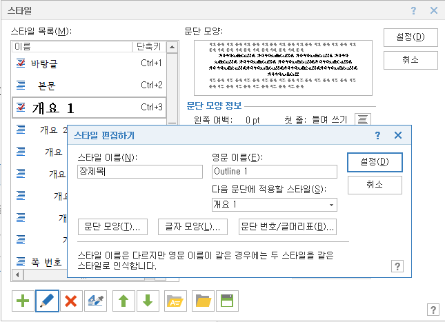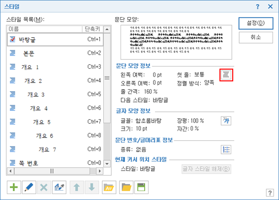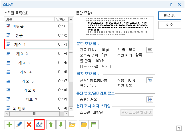 왼쪽에 있는 개요들을 하나하나 변경해 가면서 스타일을 지정하는 방법에 대해서 알아보겠습니다.