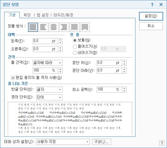 여백, 들여쓰기들여 쓰기, 내어쓰기, 줄 간격과 같은 문단 모양 관련 설정들을 조정할 수 있습니다