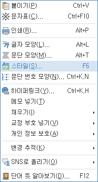 변경된 내용들은 한글 메뉴에서 확인할 수 있으며, Ctrl+숫자키를 단축키를 활용해서 사용할 수도 있습니다.
