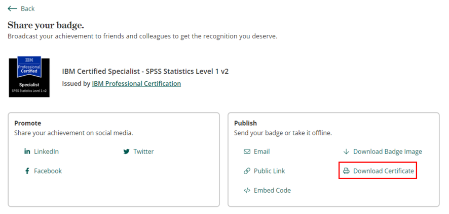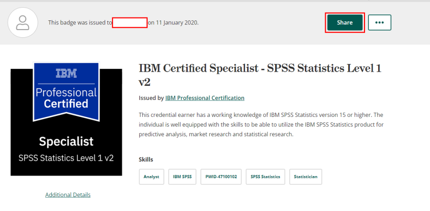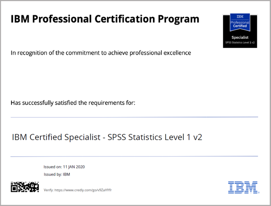 SPSS로 딸 수 있는 자격증은 사회조사분석사 이외에도 IBM에서 주는 IBM Certified Specialist - SPSS Statistics Level 1 이라는 자격증도 있다 시험과 관련된 정보는 https://www.ibm.com/certify/exam?id=C2090..