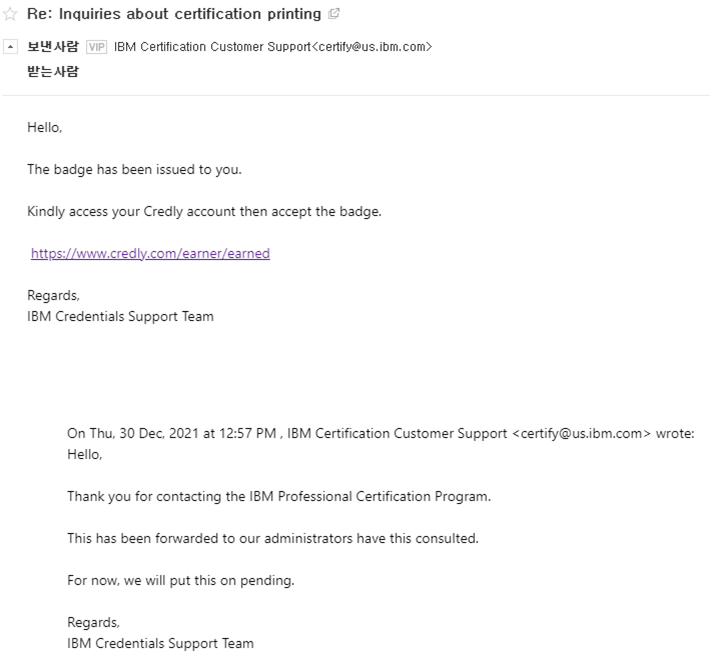 certify@us.ibm.com 으로 보내야지 credly라는 사이트와 자격증이 연동되는 업무를 도와줄 수 있습니다