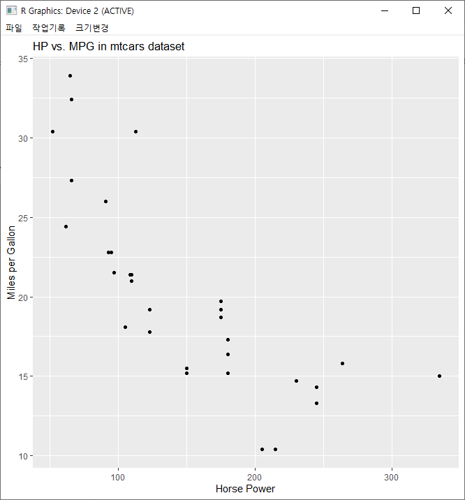 ggplot2 패키지를 사용하면, 다양한 시각화 기법을 쉽게 적용할 수 있습니다. 여기서는 mtcars 데이터셋의 연비(mpg)와 마력(hp) 간의 관계를 산점도로 그려보겠습니다.