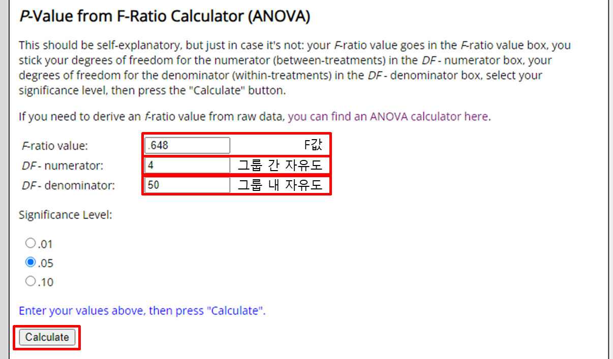 입력창에 F값, 그룹 간의 자유도, 그룹 내의 자유도를 입력하고 Calculate버튼을 클릭합니다.