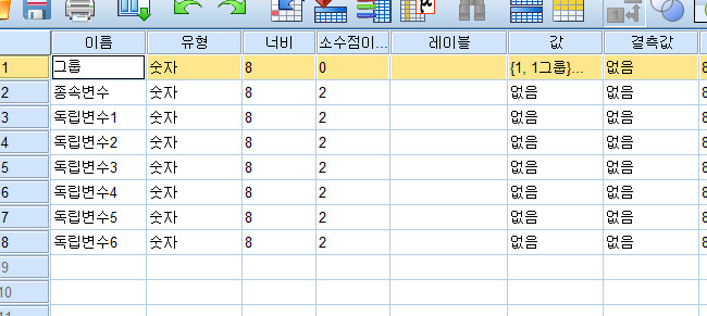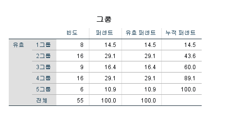 그룹 이라는 변수는 총 5개집단으로 코딩했고 전체 55개의 데이터 입니다.