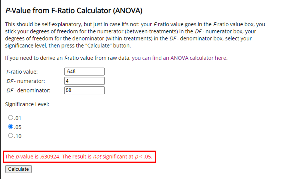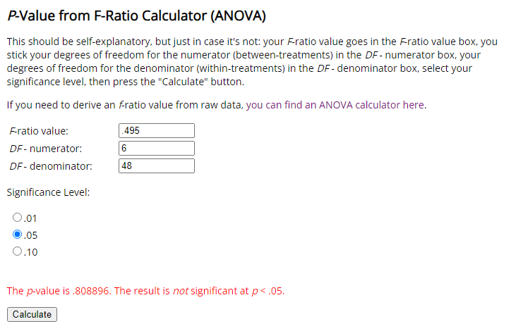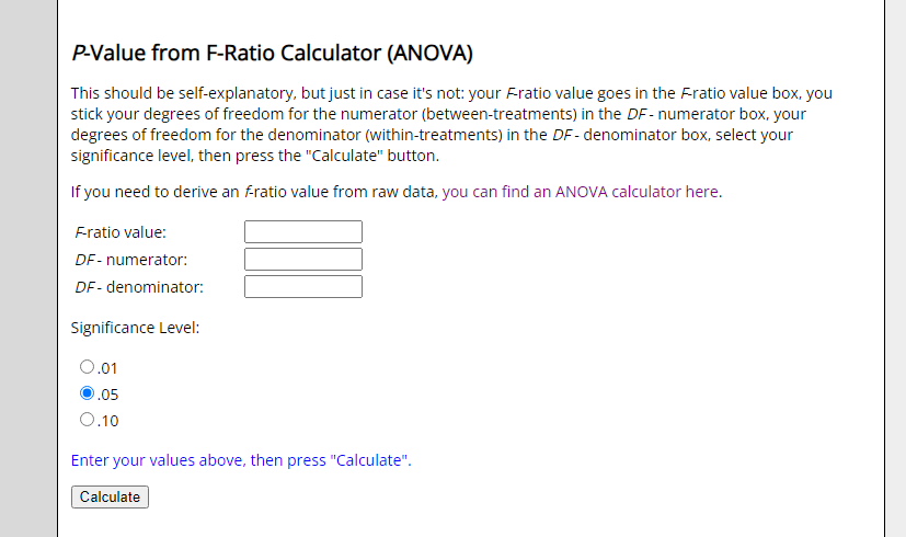 This should be self-explanatory, but just in case it's not: your F-ratio value goes in the F-ratio value box, you stick your degrees of freedom for the numerator (between-treatments) in the DF - numerator box, your degrees of freedom for the denominator (w