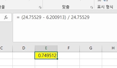 (24.75529 - 6.200913) / 24.75529 = 0.749512