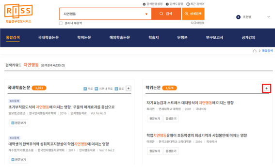검색결과 창에서 학위논문 옆에 있는 +버튼을 클릭합니다.