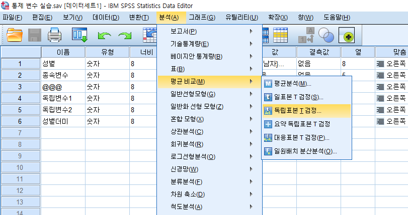 상단메뉴에 분석(A) → 평균 → 독립표본T검정을 클릭합니다.