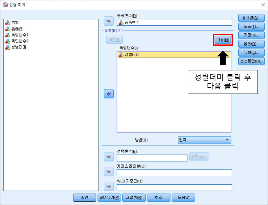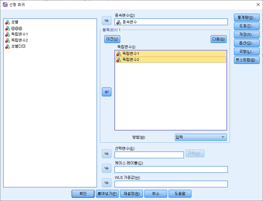 독립변수1, 독립변수2를 모두 투입하고 확인 버튼을 클릭하여 결과를 확인합니다.