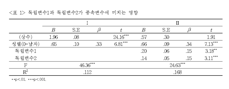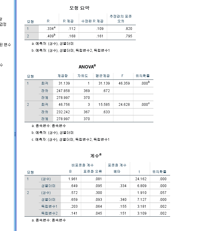 성별의 통제효과가 투입되었음에도 독립변수1과 독립변수2는 종속변수에 통계적으로 유의하게 정적 영향을 미치는 것으로 나타났습니다.