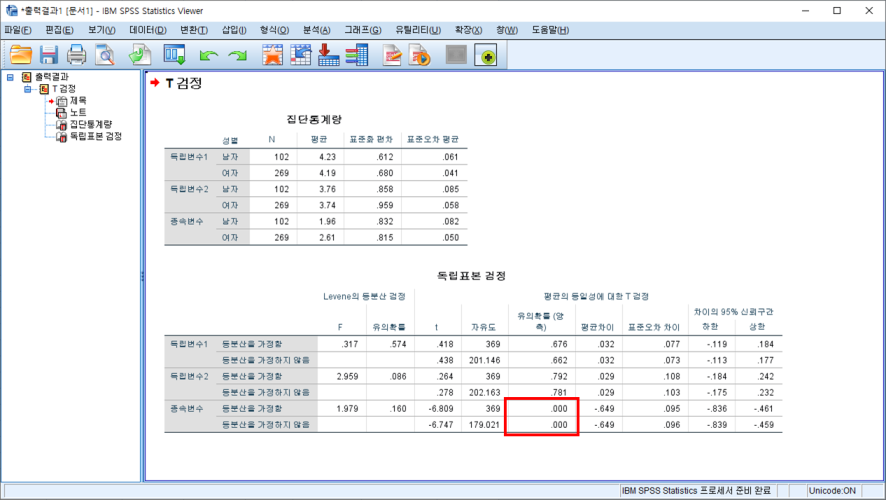 집단변수에는 성별, 검정변수에는 검정할 모든 변수를 넣어주고 확인을 클릭하여 결과를 확인합니다.