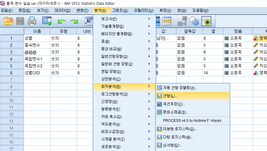상단메뉴에 분석(A) → 회귀분석(R) → 선형(L)을 클릭합니다.
