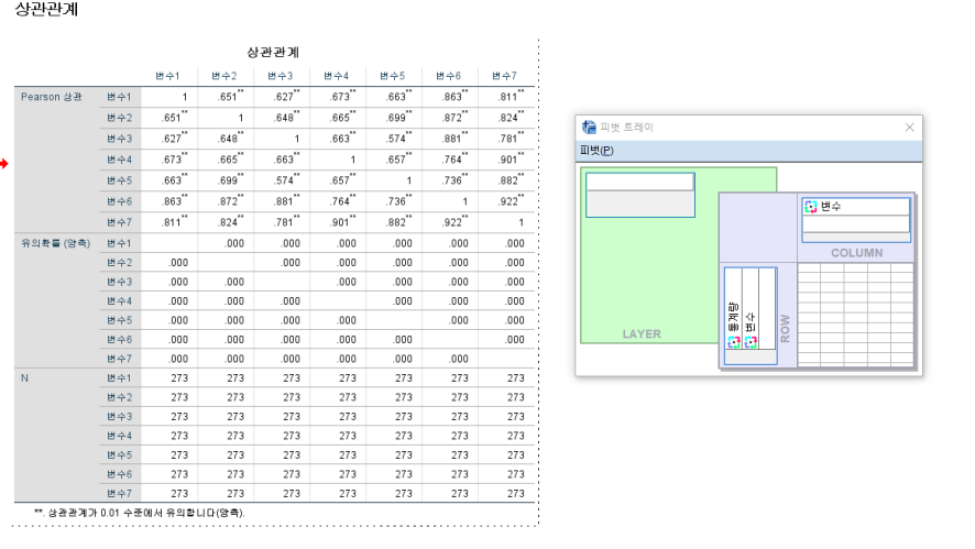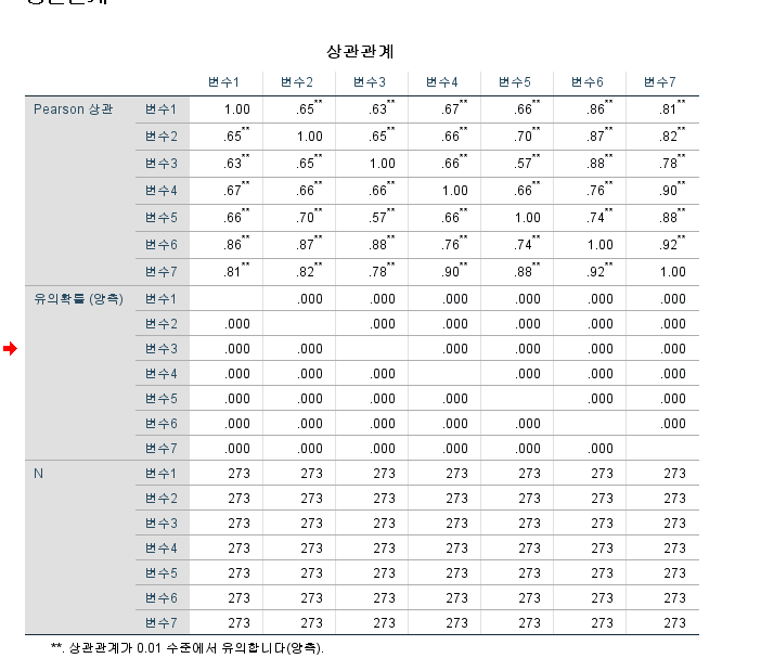 상관분석을 하게 될 경우, 상관계수, 유의확률, N이 모두 표기되어 있습니다.
