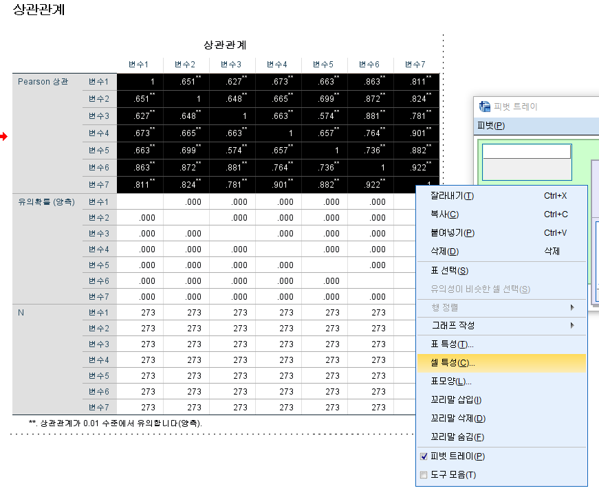 상관계수를 모두 드래그 한 다음 우클릭을 하고 셀특성을 클릭합니다.