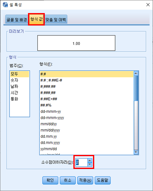 그 다음, 상단 메뉴는 형식 값을 클릭하면 하단에 소수점이하자리라는 메뉴를 볼수 있는데 거기에 2라고 적고 확인을 클릭합니다.