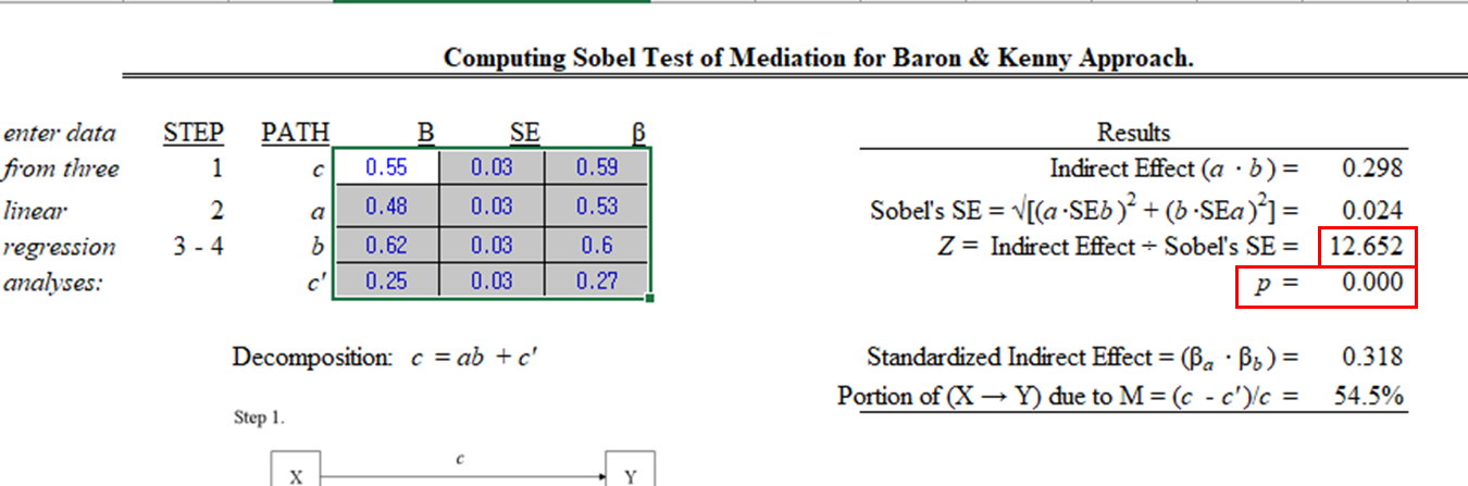 붙여넣기 하면 자동으로 소벨테스트의 검정값인 Z값과 p값이 생성됩니다.