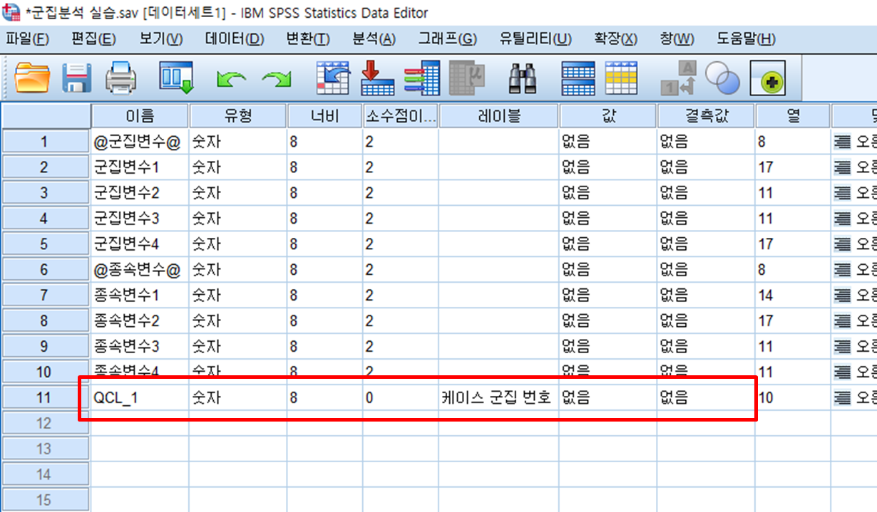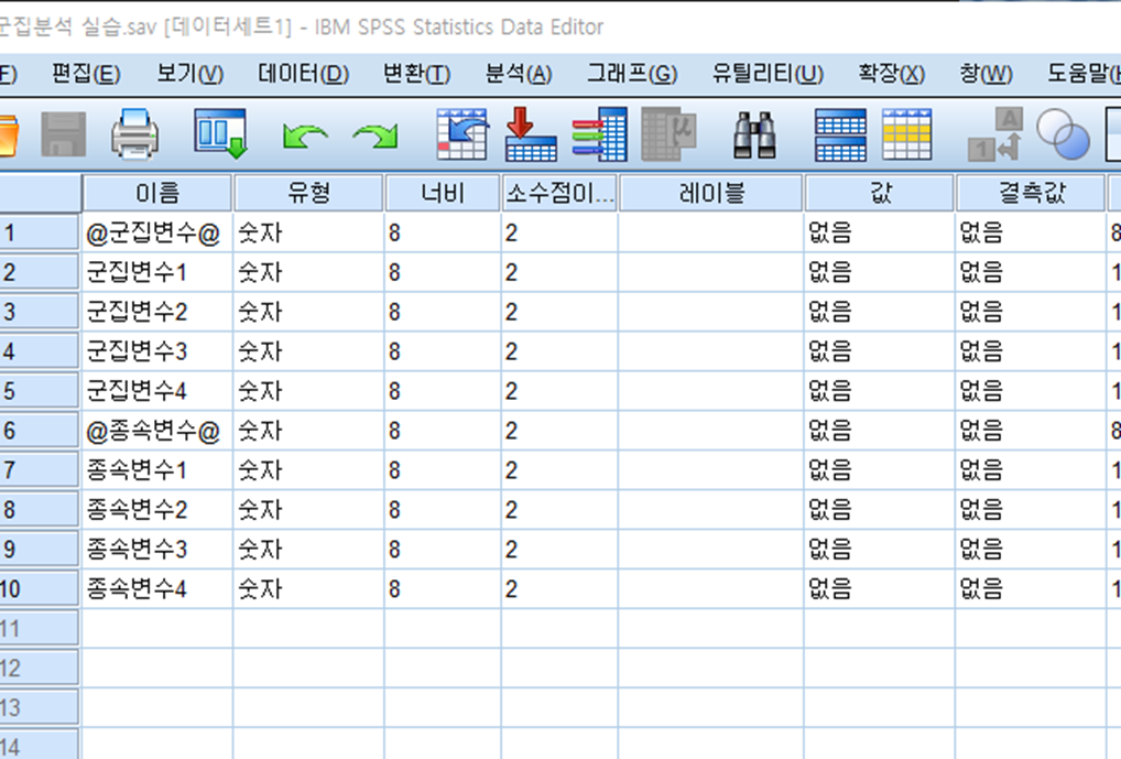 SPSS의 변수보기를 클릭하면 새로운 변수가 생성된 것을 확인할 수 있습니다. 군집변수를 기반으로 변수가 생성된 것을 확인할 수 있습니다.