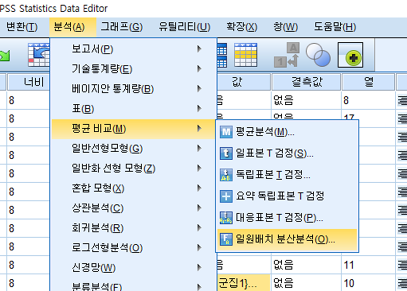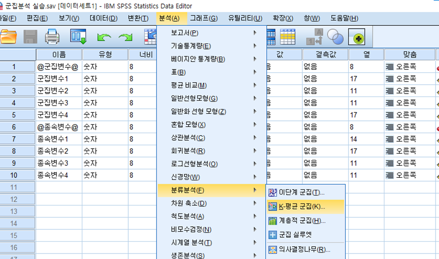 상단 메뉴에서 분석(A) → 분류(F) → 군집분석(K)을 클릭합니다.