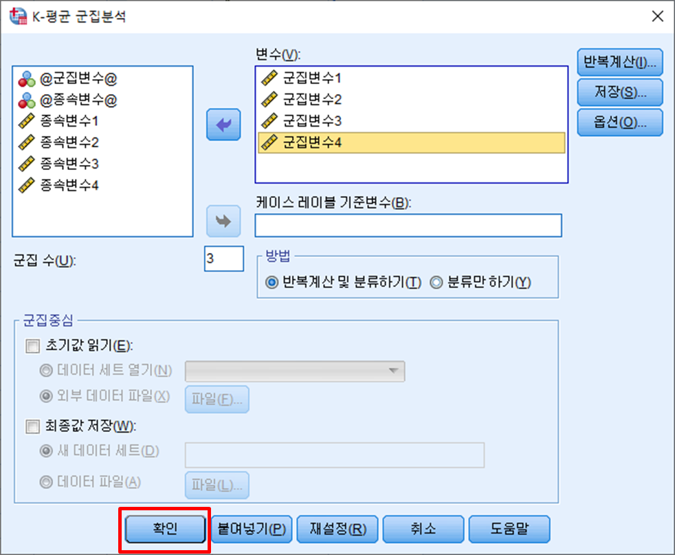 군집변수는 군집변수를 기반으로 데이터를 분류해줄 변수입니다 모두 변수로 옮겨줍니다.