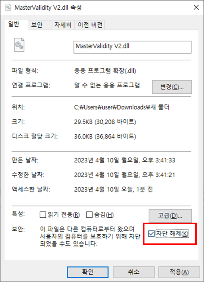 차단 해제(K)를 클릭하고 하단의 확인을 클릭합니다.