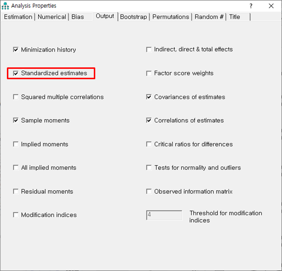 분석 옵션에서 Standardized estimates가 체크되어야지 결과가 나옵니다. 꼭 확인해주세요