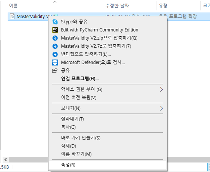 다운 받은 파일을 우클릭 하여 속성(R)을 클릭합니다.